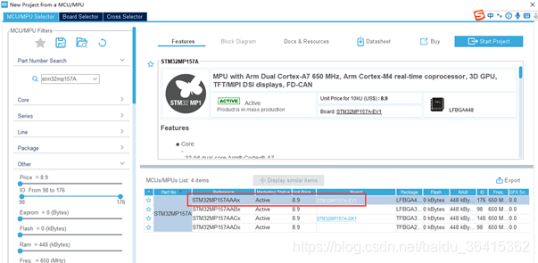 由于pangu开发板选用的是stm32mp157AAA3芯片,故选择stm32mp157AAAX