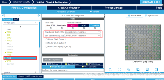 接下来配置时钟源,如果选择使用外部高速时钟(HSE),则需要在System Core中配置RCC;
